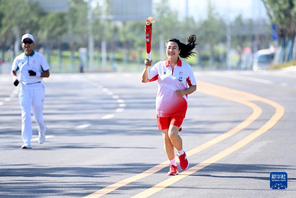 9月12日,火炬手郭晓燕在火炬传递中。新华社记者 刘潇 摄