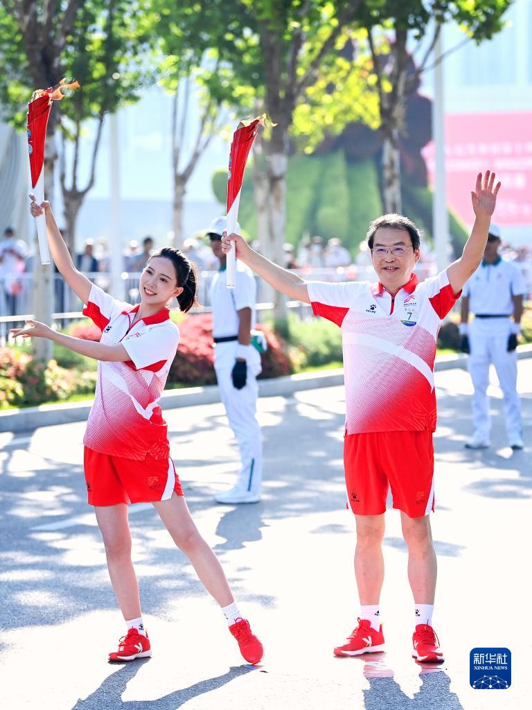 9月12日,火炬手李新春(左)和汪丽丽在火炬传递中。新华社记者 刘潇 摄