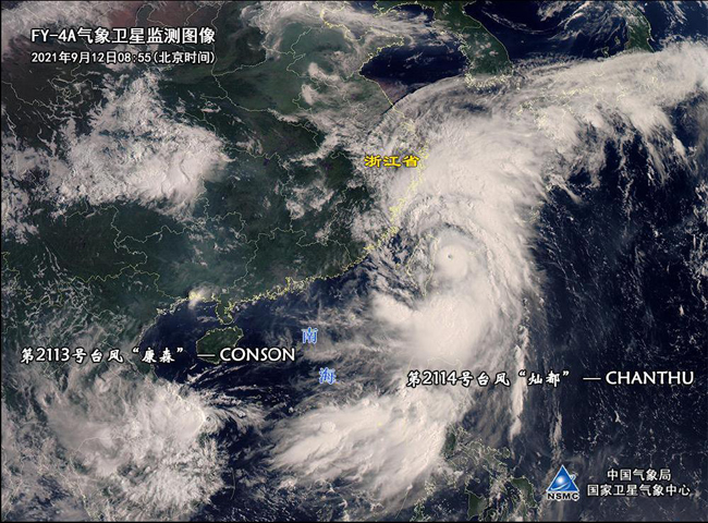 2021年9月12日08:55(北京时)台风“灿都”“康森”风云四号A星气监测云图。来源:国家卫星气象中心