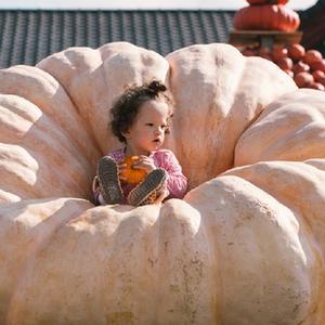 9月12日,在德国洛马尔传统南瓜节上,一名儿童在一个巨型南瓜上留影。