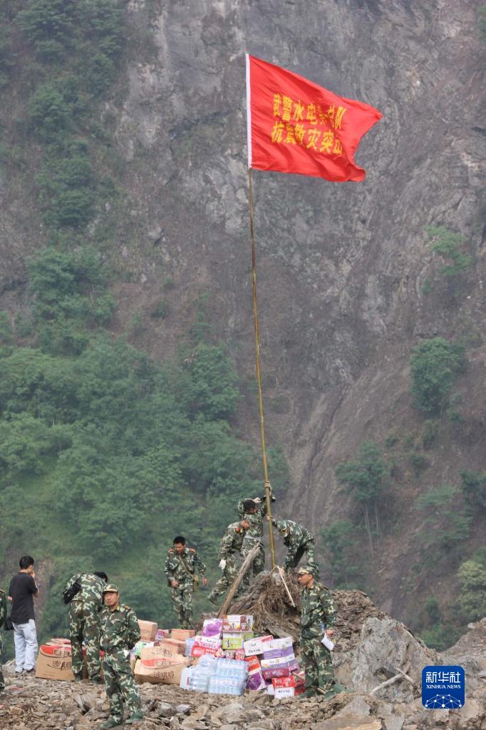 武警水电部队官兵把红旗竖起在唐家山堰塞湖抢险前沿(2008年5月26日摄)。新华社记者李刚摄