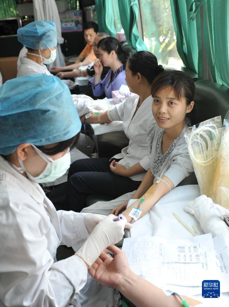 郑州市委干部肖静在流动献血车上献血(2008年5月14日摄)。2008年5月14日,数百名郑州市直机关干部职工参加援助活动,并为汶川地震灾区的受灾群众献血。新华社记者 赵鹏 摄