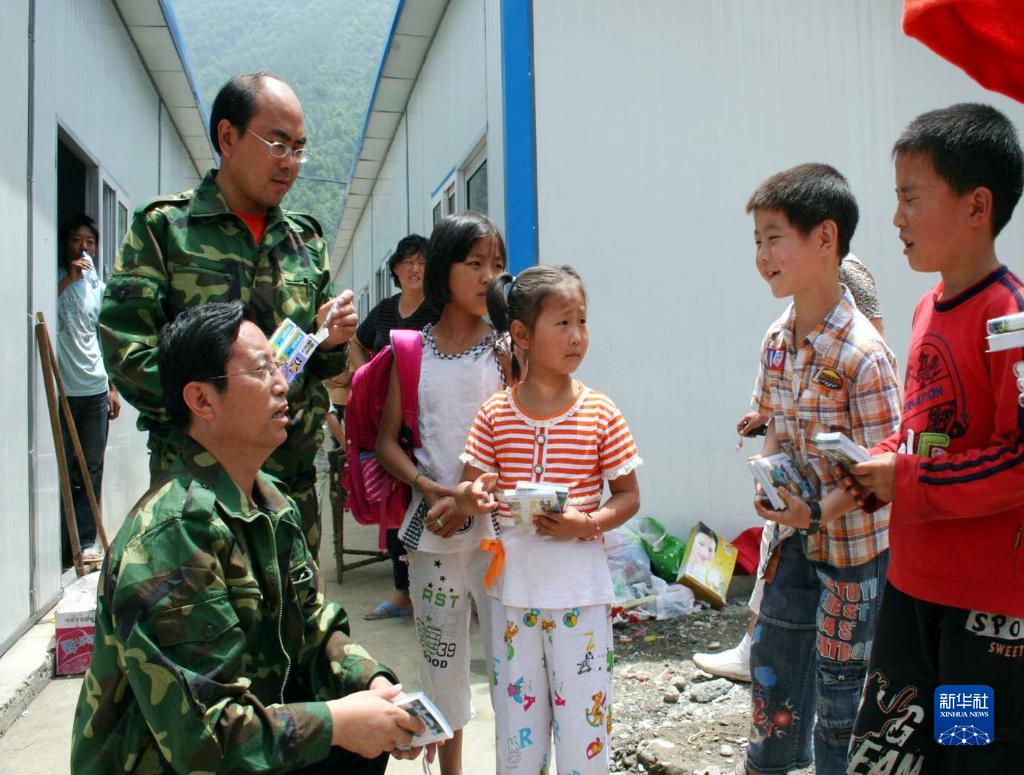 2008年“六一”儿童节当天,援川干部崔学选(前左)在北川县桂溪乡看望受灾儿童。新华社发