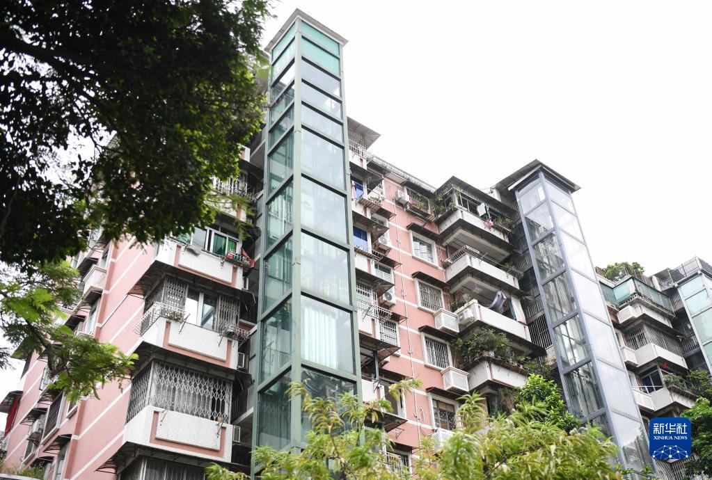 在广州海珠区沙园街道广重社区拍摄的加装电梯后的居民楼(8月5日摄)。新华社记者 邓华 摄