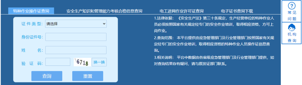 “特种作业操作证及安全生产知识和管理能力考核合格信息查询平台”界面截图。