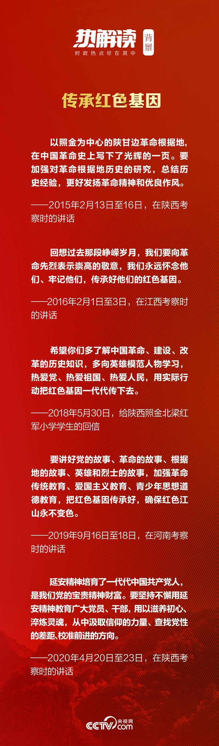 2015年陕西之行,总书记参观了党的七大会址、陕甘边革命根据地照金纪念馆、薛家寨革命旧址等,他意味深长地说:“老一辈革命家和老一代共产党人在延安时期留下的优良传统和作风,培育形成的延安精神,是我们党的宝贵精神财富。”