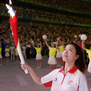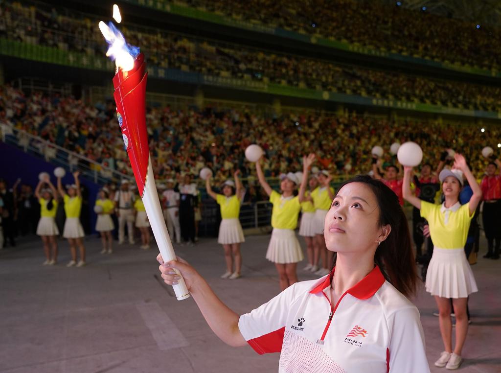 9月15日,火炬手杨倩仰望点燃的主火炬。新华社记者彭子洋摄