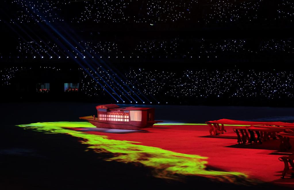 圣火映衬下,开幕式在主题歌《跨越》中渐近尾声。夜幕下的西安奥体中心体育场,像一朵石榴花一样,绽放在灞河之滨。
