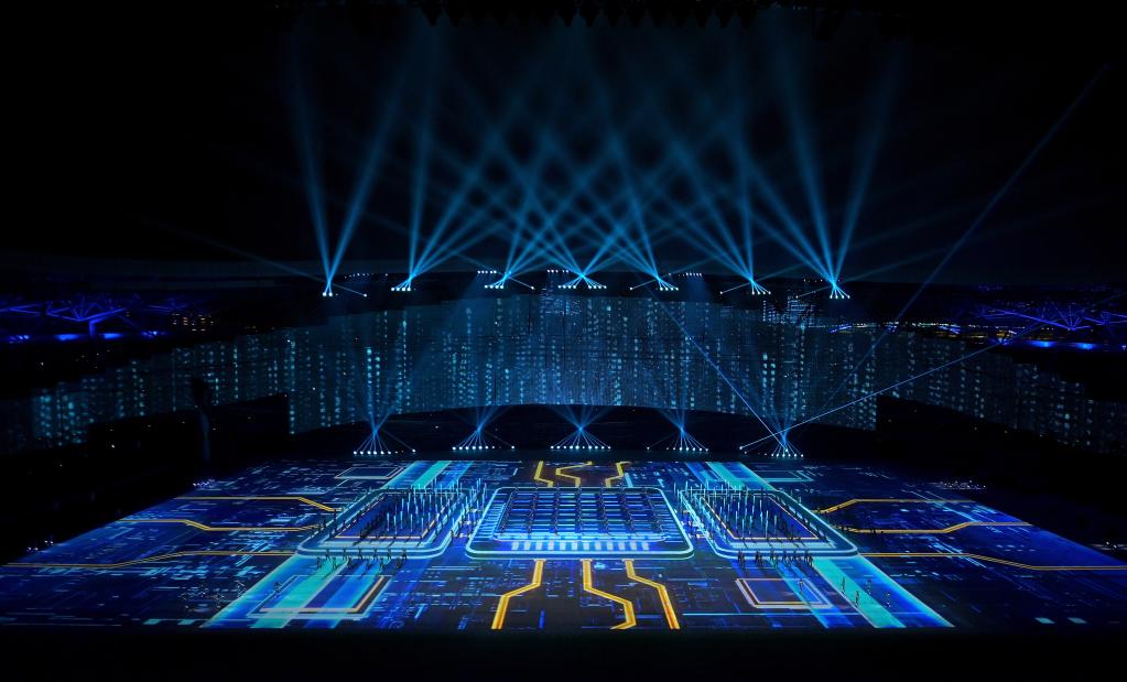 大国重器,中国制造。向深海、深空、深地、深蓝进军,陕西做出积极贡献。大好山河图景中,集成电路、芯片等高新技术元素组成了充满未来感的舞台。科技大国之门开启,象征现代化的步伐在新时代更加稳健。