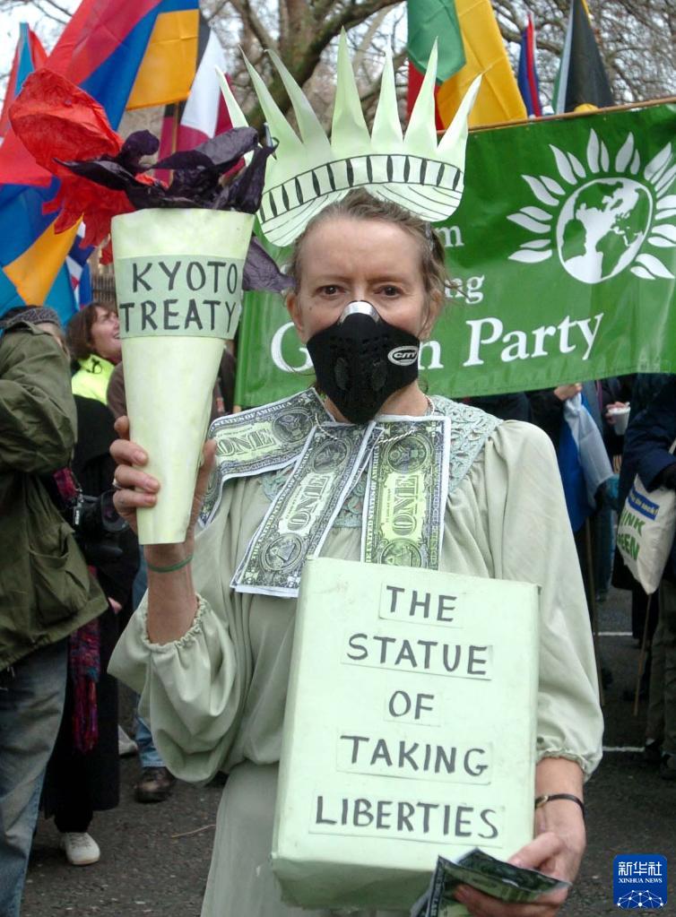 2005年2月12日,抗议者在英国伦敦手持代表《京都议定书》的火炬参加游行,谴责美国政府坚持拒绝执行《京都议定书》的立场。新华社记者 程敏 摄