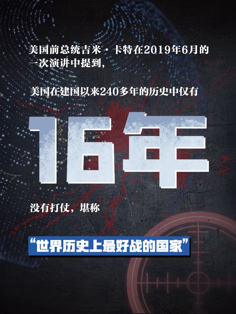 审视美国历史不难发现,“尚武”“黩武”写在美国基因之中。美国在战争、奴役和屠杀中诞生、壮大并成为超级大国,其在国际舞台上的亮相以及影响力的提升,都与重大战争有关。美国前总统吉米·卡特在2019年6月的一次演讲中提到,美国在建国以来240多年的历史中仅有16年没有打仗,堪称“世界历史上最好战的国家”。美国《国家利益》杂志援引美国传统基金会防务项目高级研究员达科塔·伍德的话说,美国平均每15年就卷入一场战争。