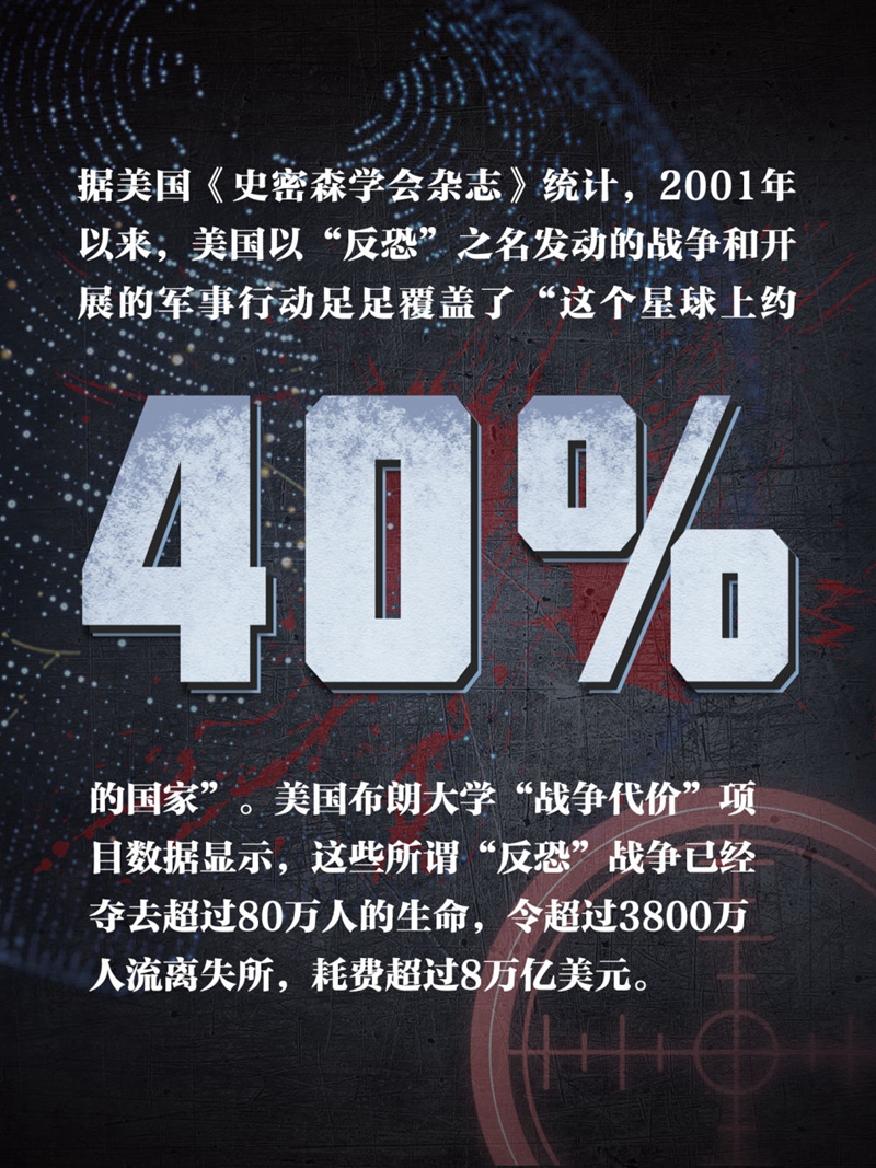 据美国《史密森学会杂志》统计,2001年以来,美国以“反恐”之名发动的战争和开展的军事行动足足覆盖了“这个星球上约40%的国家”。美国布朗大学“战争代价”项目数据显示,这些所谓“反恐”战争已经夺去超过80万人的生命,令超过3800万人流离失所,耗费超过8万亿美元。