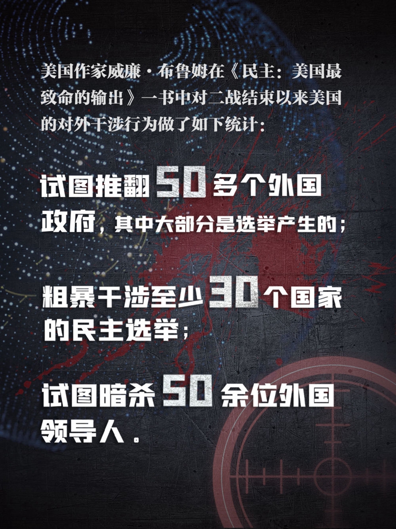 美国是干涉别国内政的“瘾君子”,是煽动别国内乱的肮脏“黑手”。美国作家威廉·布鲁姆在《民主:美国最致命的输出》一书中对二战结束以来美国的对外干涉行为做了如下统计:试图推翻50多个外国政府,其中大部分是选举产生的;粗暴干涉至少30个国家的民主选举;试图暗杀50余位外国领导人。