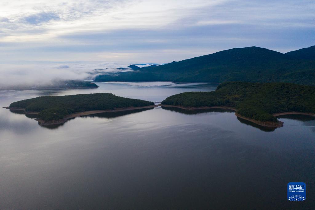 9月17日拍摄的镜泊湖世界地质公园晨景(无人机照片)。