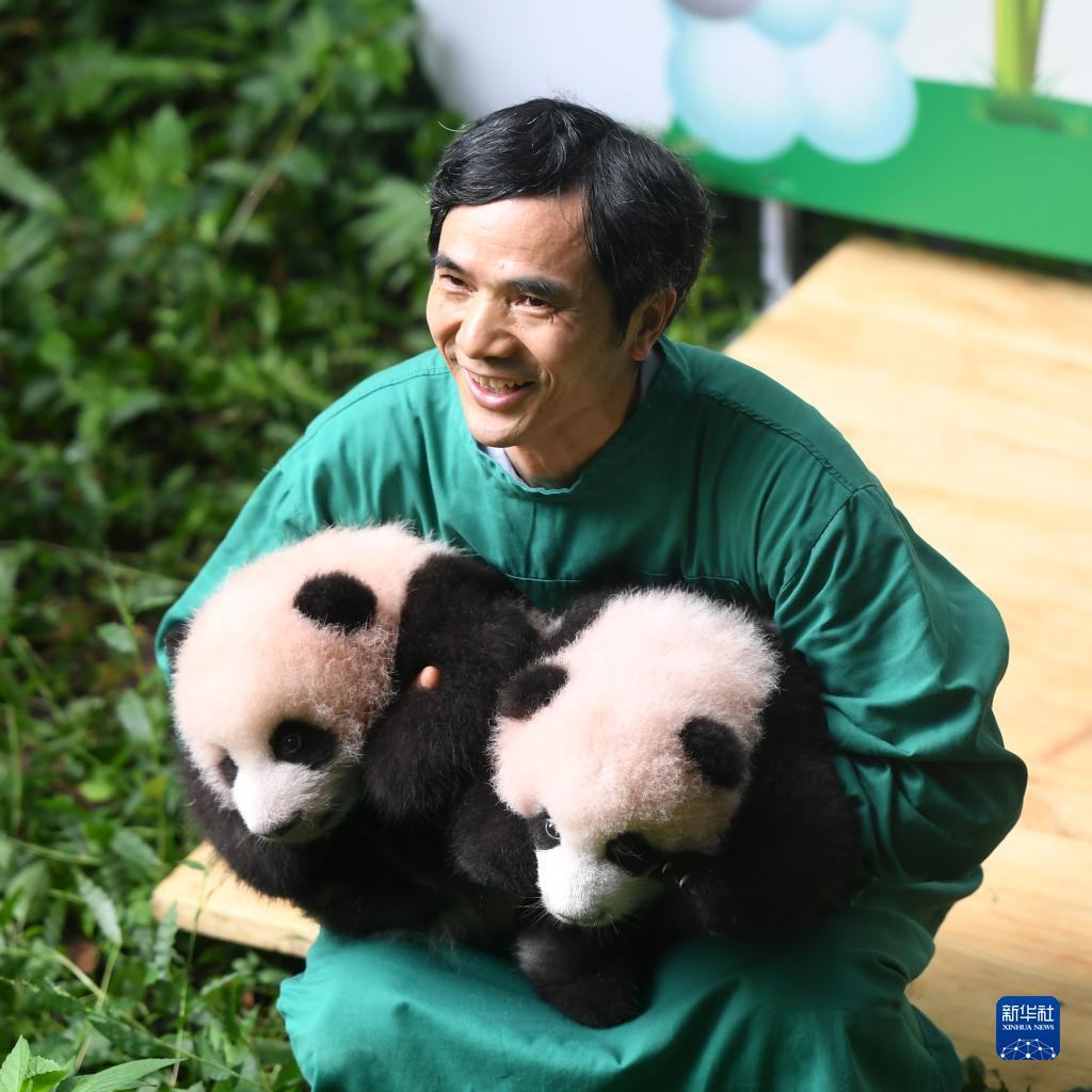 9月17日,首次户外亮相的大熊猫双胞胎与饲养员合影。