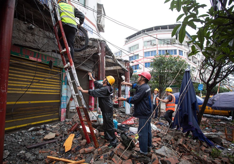 ↑ 9月16日,在泸县福集镇大田社区,通信部门的工作人员在整理线路。