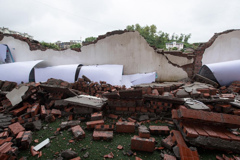 ↑ 这是9月16日在泸县福集镇大田社区拍摄的在地震中垮塌的墙体。
