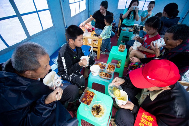 ↑ 9月16日,在泸县福集镇龙脑桥中心校安置点,受灾群众在帐篷里吃午饭。