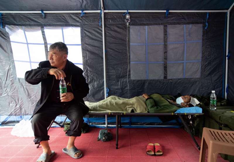↑ 9月16日,在泸县福集镇龙脑桥中心校安置点,受灾群众罗阳水在照顾地震中受伤的妻子周继英。