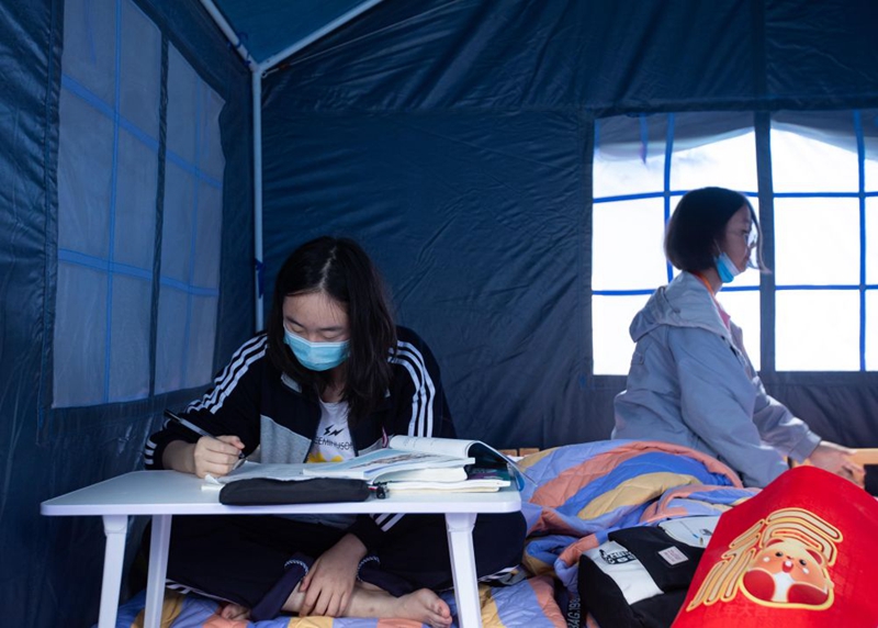 我问她地震时反应为什么那么快,她告诉我:“学校每个学期都要进行防灾疏散演练,被摇醒知道是地震后往外冲,成自然反应了。”我又问:“帐篷外一片杂乱嘈杂,你怎么那么淡定地学习?”她说:“我今年初三,想考好一点的高中,而且我是大姐,得做个榜样。”
