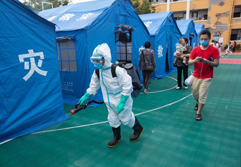 ↑ 9月16日,防疫人员在泸县福集镇龙脑桥中心校安置点消杀。