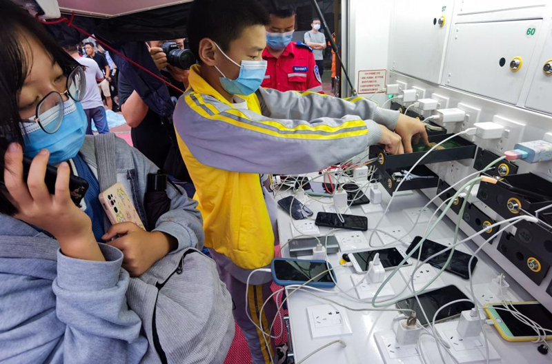 ↑ 9月16日,在泸县福集镇龙脑桥中心校安置点,受灾群众在临时充电站给手机充电。