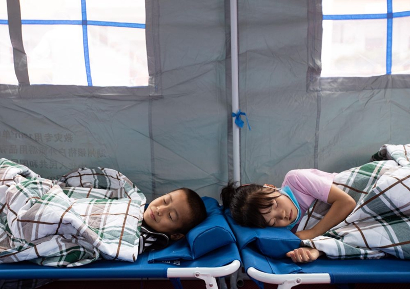 ↑ 9月16日,在泸县福集镇龙脑桥中心校安置点,两个孩子在帐篷里入睡。