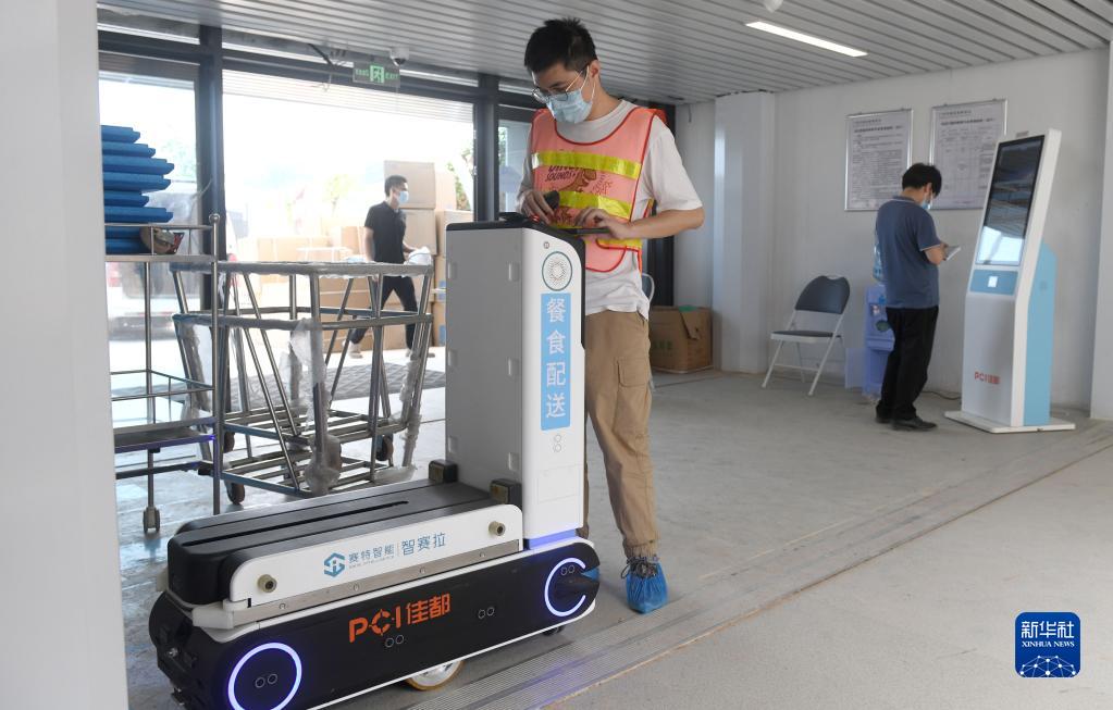 9月17日,工作人员在广州市国际健康驿站调试自动送餐机器人。新华社记者 卢汉欣 摄