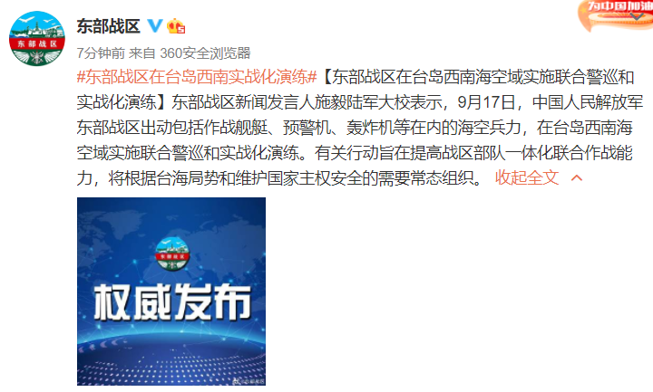 东部战区新闻发言人施毅陆军大校表示,9月17日,中国人民解放军东部战区出动包括作战舰艇、预警机、轰炸机等在内的海空兵力,在台岛西南海空域实施联合警巡和实战化演练。有关行动旨在提高战区部队一体化联合作战能力,将根据台海局势和维护国家主权安全的需要常态组织。