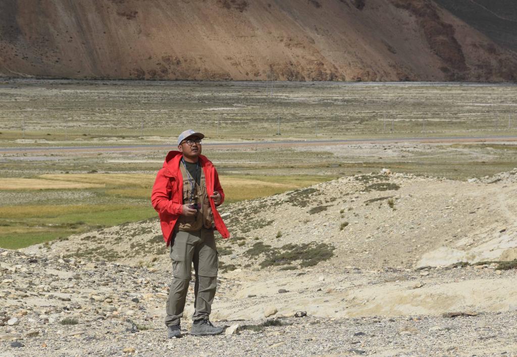 8月27日,科考队员王昊手里握着测距仪,对山体进行观察。新华社记者杜刚 摄