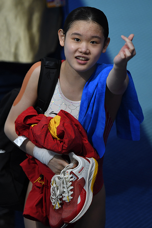 图为全运会上张家齐在赛后比心庆祝