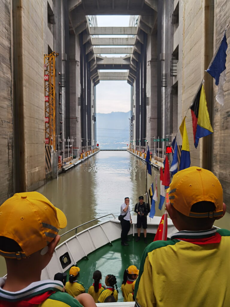 图为湖北省宜昌市五峰县一小学的学生乘船参观三峡升船机。 新华社记者 王贤 摄