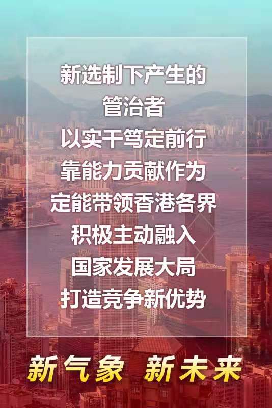 “惟希望也,故进取;惟进取也,故日新。”我们相信,新选制下产生的管治者,必将以实干笃定前行,靠能力贡献作为,定能带领香港各界积极主动融入国家发展大局,打造竞争新优势。我们坚信,有伟大祖国作坚强后盾,有14亿多中国人民全力支持,全体香港同胞团结一致、不懈奋斗,“一国两制”在港实践必将焕发新的生机和活力,香港定能再创新猷,大有可为!