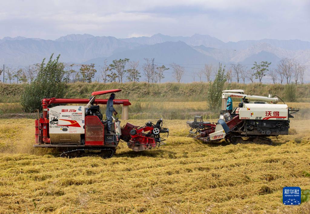 时下,宁夏贺兰山下的水稻陆续成熟,当地农民抢抓晴好天气收割水稻,田间地头一派繁忙景象。
