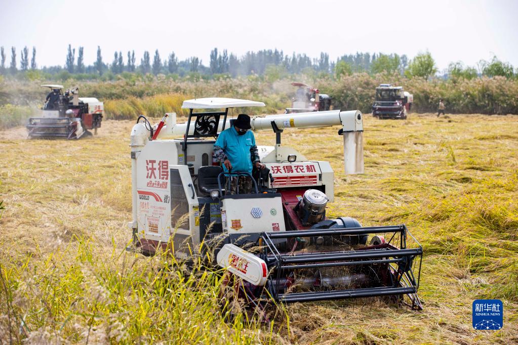9月20日,在宁夏石嘴山市平罗县境内的前进农场,农民驾驶收割机收割水稻。