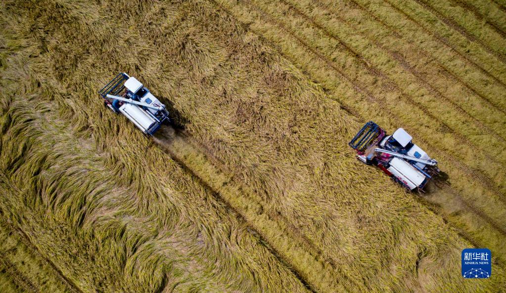9月20日,在宁夏石嘴山市平罗县境内的前进农场,农民驾驶收割机收割水稻(无人机照片)。