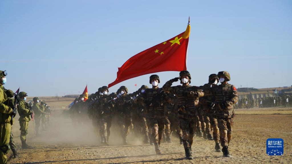 9月20日,在俄罗斯奥伦堡州东古兹靶场举行的“和平使命-2021”上海合作组织联合反恐军事演习开幕式上,中方参演部队接受检阅。新华社发(刘丹 摄)