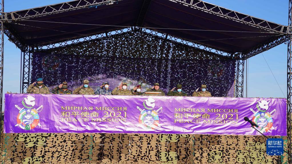 这是9月20日在俄罗斯奥伦堡州东古兹靶场拍摄的“和平使命-2021”上海合作组织联合反恐军事演习开幕式现场。新华社记者 梅世雄 摄