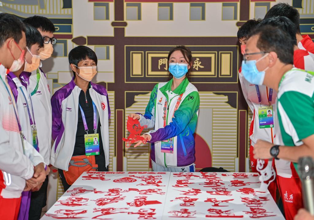 全运村里的非物质文化遗产展厅,集纳了剪纸、刺绣、皮影、面塑等数十种陕西民间艺术展品。全运会期间,成为运动员村里的网红打卡地。中秋前夜,这里又记录了陕港澳运动员共庆佳节的美好时刻。