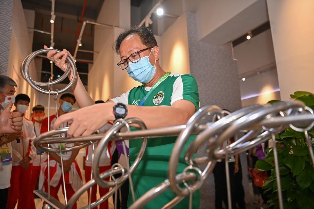 9月20日,来自澳门代表团的田径项目领队区志权在体验九连环