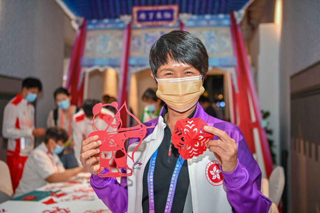 9月20日,香港射箭运动员林淑贞展示自己的剪纸作品