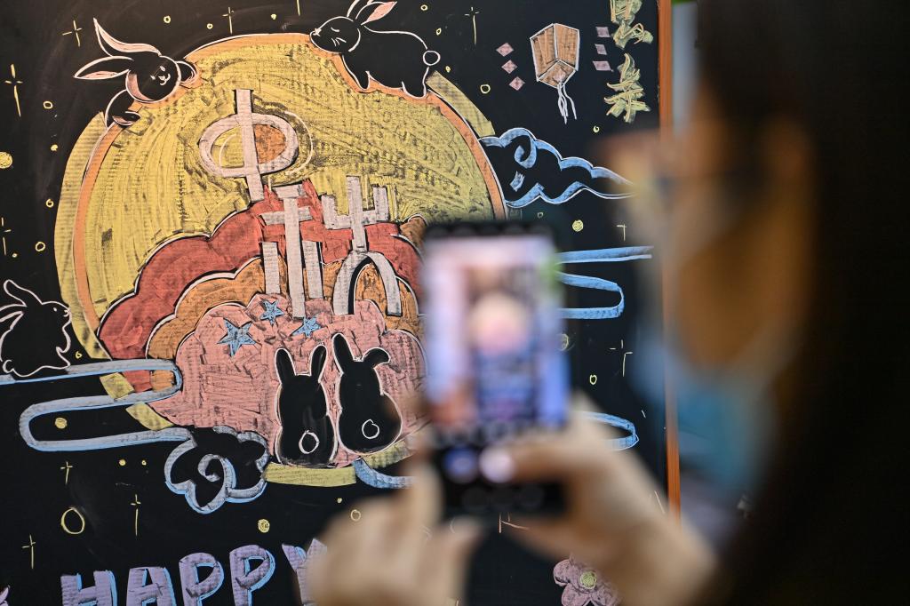 9月20日,一名工作人员在拍摄全运村里的中秋黑板画