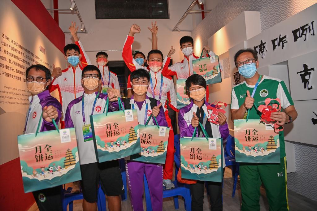 9月20日,陕西、香港、澳门代表团成员展示他们收到的全运月饼