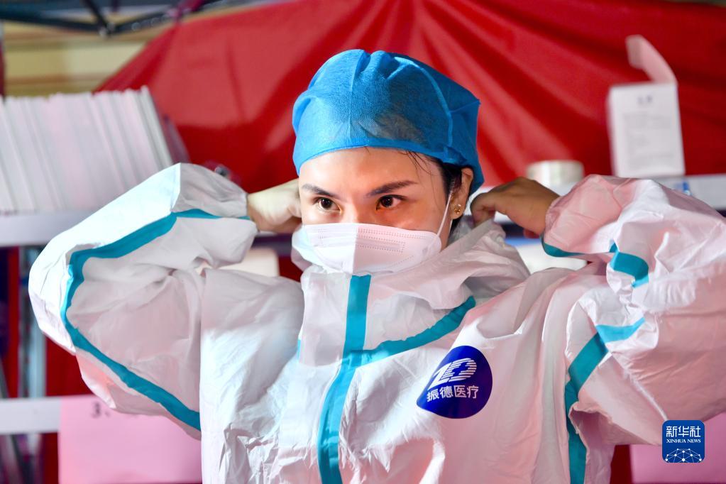 9月21日,在因疫情管控的厦门市福满家园小区,参与疫情防控的后江社区网格员叶露艳在穿戴防护服。新华社记者姜克红 摄