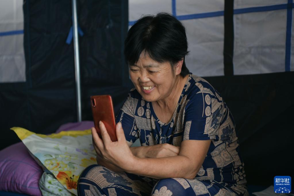 9月21日,在泸县福集镇团仓村受灾群众安置点,受灾人员与亲戚视频互道节日祝福。