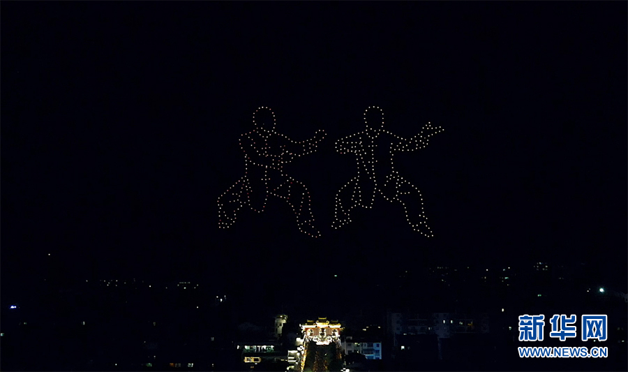 9月20日,武当中秋无人机空中展演在武当山玉虚宫上空上演。晚上7点30分,闪烁着红、黄、蓝、绿等不同色光的500架无人机编队,从地面依次腾空,不断变换阵型,呈现出北斗星、玄武图、太极图、“福寿康宁”等9幅极具美好寓意和武当元素的空中图案。