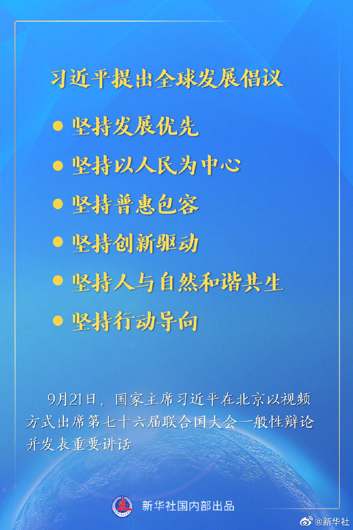 国家主席习近平21日在北京以视频方式出席第七十六届联合国大会一般性辩论并发表重要讲话。习近平强调,发展是实现人民幸福的关键。面对疫情带来的严重冲击,我们要共同推动全球发展迈向平衡协调包容新阶段。习近平提出全球发展倡议:一是坚持发展优先;二是坚持以人民为中心;三是坚持普惠包容;四是坚持创新驱动;五是坚持人与自然和谐共生;六是坚持行动导向。