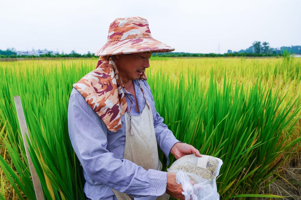 ↑9月8日,在成都邛崃市天府现代种业园,四川农业大学水稻研究所科研助理代文明在展示试验田收获的谷子。新华社发 黎琳 摄