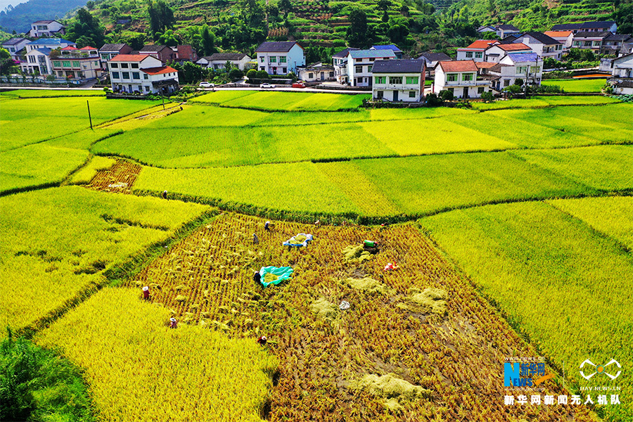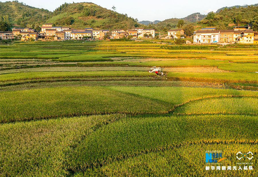 金黄的稻田里热闹的机收场景随处可见,农民抓住晴好天气忙秋收,确保水稻颗粒归仓。新华网发(甘昊旻 摄)