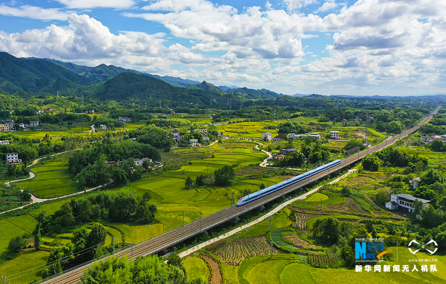 高铁从梁平稻田间穿行而过。新华网发(熊伟 摄)